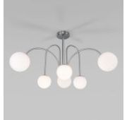 В люстре используются сменные лампы с цоколем E27, рассчитанные на максимальную мощность 60 Вт. Потолочный светильник оснащен стеклянными плафонами. В производстве светильника использован высококачественный металл с надежным защитным покрытием.